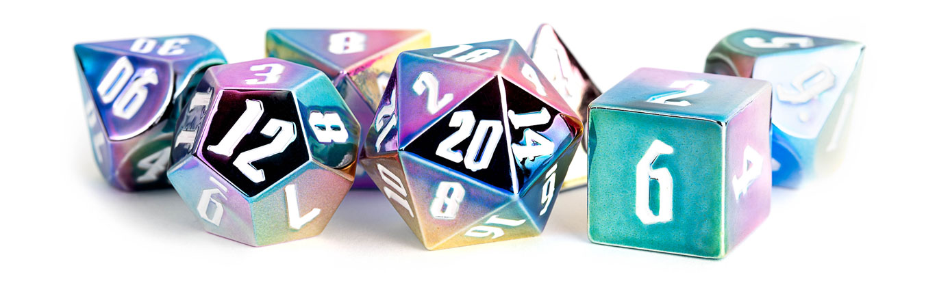 Rainbow Aegis Dice are a molded acrylic set, electroplated with a durable aluminum shield. This set offers the utility of plastic dice, with the beautiful look and feel of metal dice.