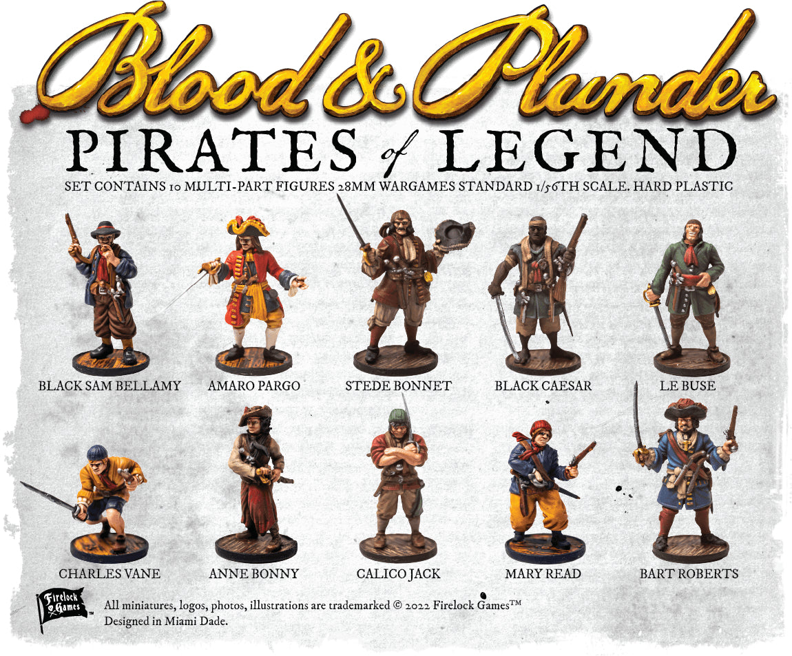 10x 28mm plastic Legendary Commanders and their unit cards. Represented captains are: Black Sam Bellamy, Stede Bonnet, Anne Bonny, Mary Read, Black Bart, Amaro Pargo, Calico Jack, Le Buse, Charles Vane, and Black Ceasar!