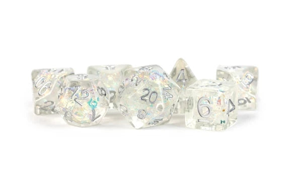 Rainbow Frost dice are infused with holographic paper that shimmers in the light. These are full-sized 16mm polyhedral dice sets that come with 7 dice (d4, d6, d8, d10, d10%(00-90), d12, and d20).