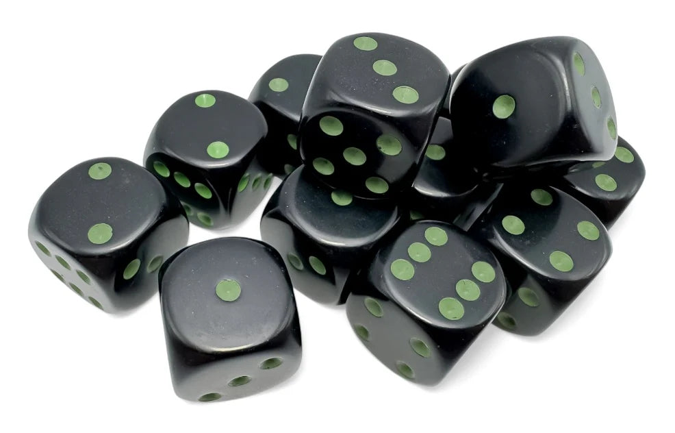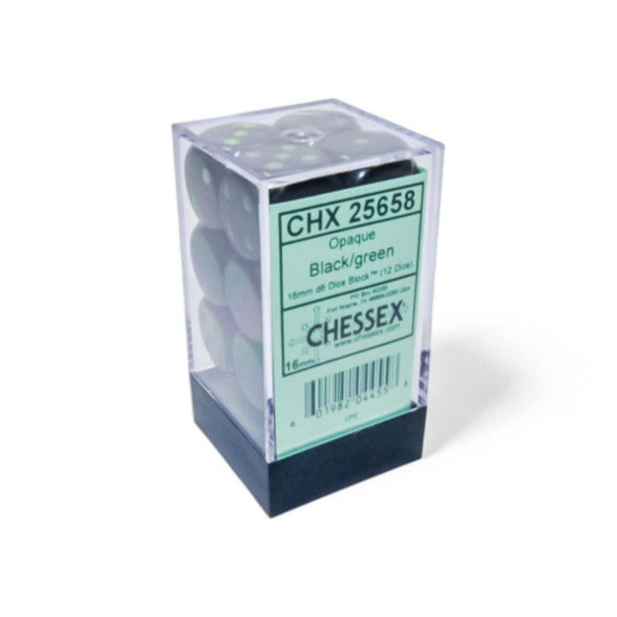 Chessex: Opaque 16mm d6 Black/green Dice Block (12 dice)
