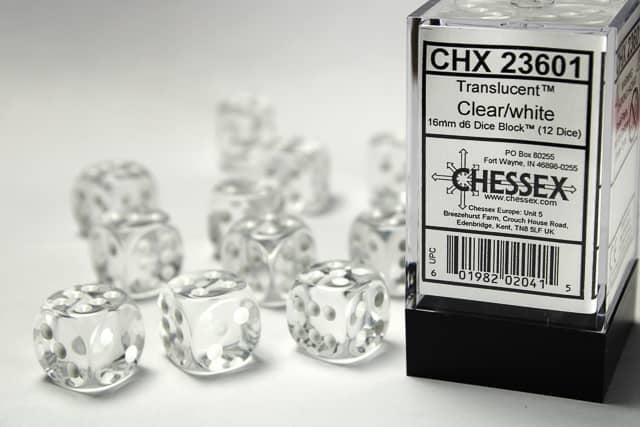 Chessex: Translucent - 16mm D6 Clear/White (12)