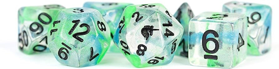 Unicorn dice are a beautiful mix of transparent resins, which are then infused with prismatic glitter dust that changes from blues to purples to greens as it hits the light. Each 16mm polyhedral set comes with 7 dice (d4, d6, d8, d10, d10 (00-90), d12, and d20).