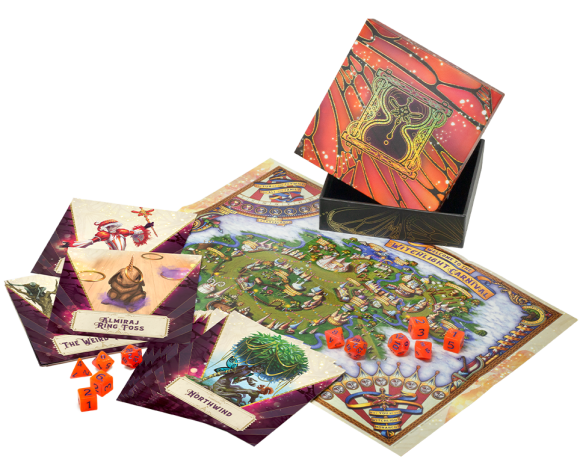 19 double-sided reference cards with descriptions and illustrations of characters, creatures, games, and other features of the Witchlight Carnival