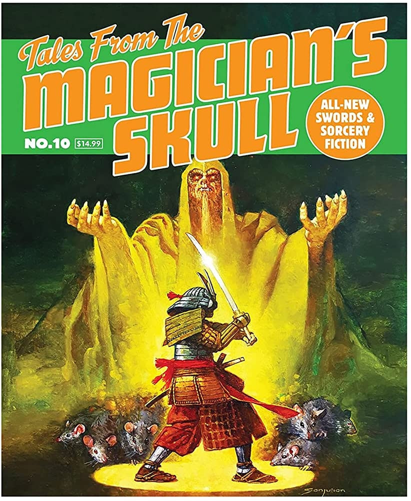 A gong shivers… the mists part to reveal a grisly visage lying upon a mound of rubble, dead but for one glowing, malefic eye… It speaks, in a voice of cold command: It is time now for Tales From The Magician’s Skull #10! You are surely delighted once more to hold an issue of my incomparable magazine in your febrile hands! Marvel upon marvel lie before you, so many of them in abundance that you will doubtless caper in wild abandon once you understand the boon I have granted you! In this issue, you will find nine new stories.