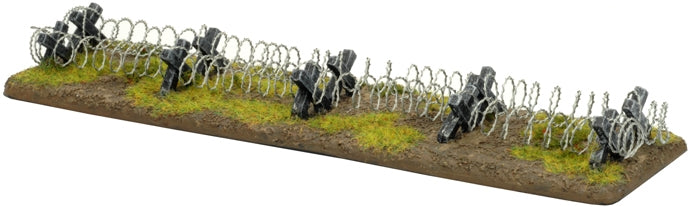 Barbed wire sections are a cheap and effective way to keep the enemy infantry from assaulting your own positions. Site your machine-guns over the wire so that you can inflict maximum damage on your opponent’s troops. Bear in mind though that tanks ignore it and clear a path for the infantry following on so make sure anti-tank guns are situated nearby to stop an enemy breakthrough. (15mm scale)