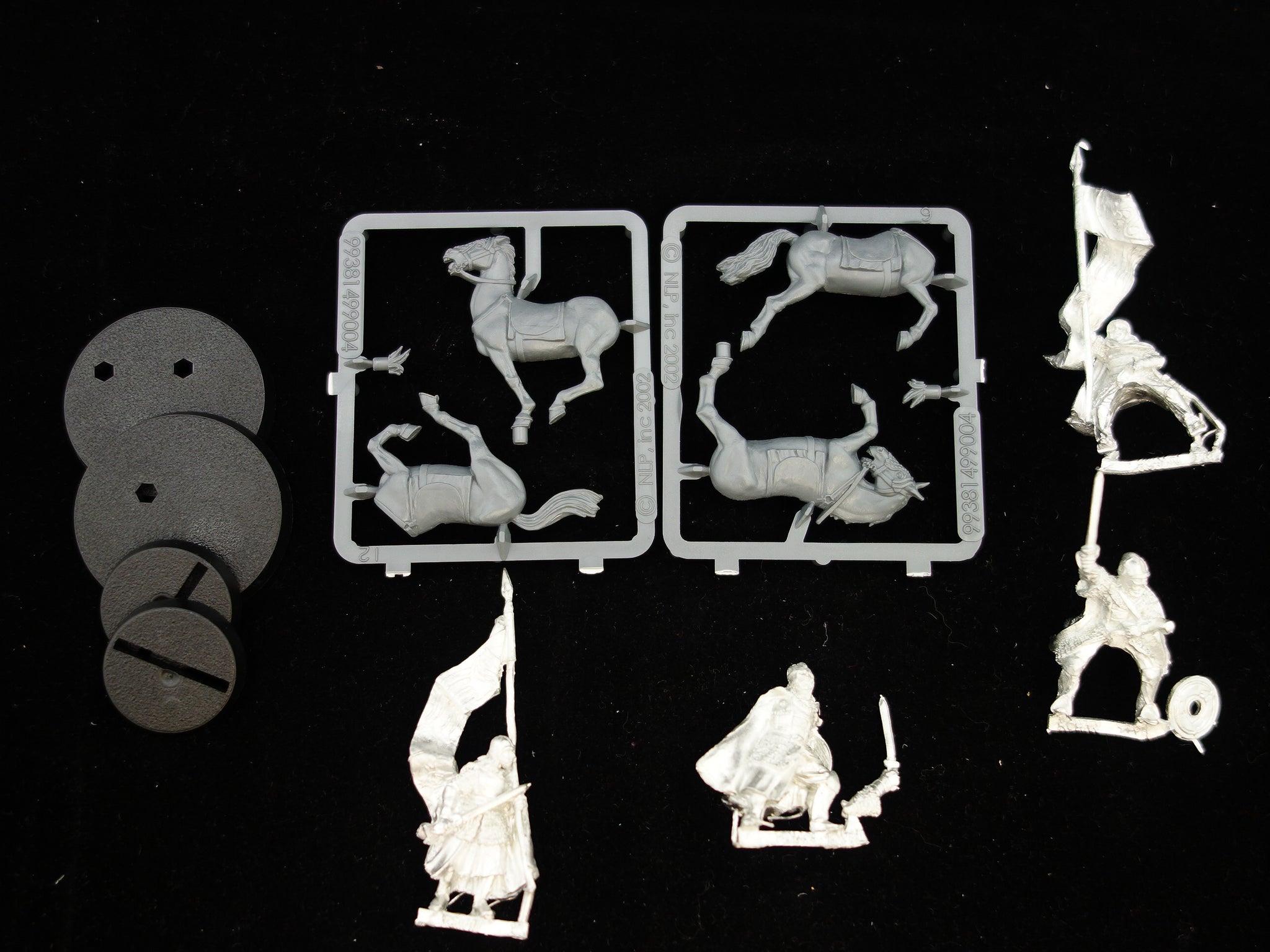 The set contains 4 metal miniatures – a Captain on foot and mounted, and a Banner Bearer on foot and mounted – as well as two plastic horses. The models come supplied with two Citadel 40mm Round Bases and two Citadel 25mm Round Bases. Their rules can be found in Armies of The Lord of The Rings