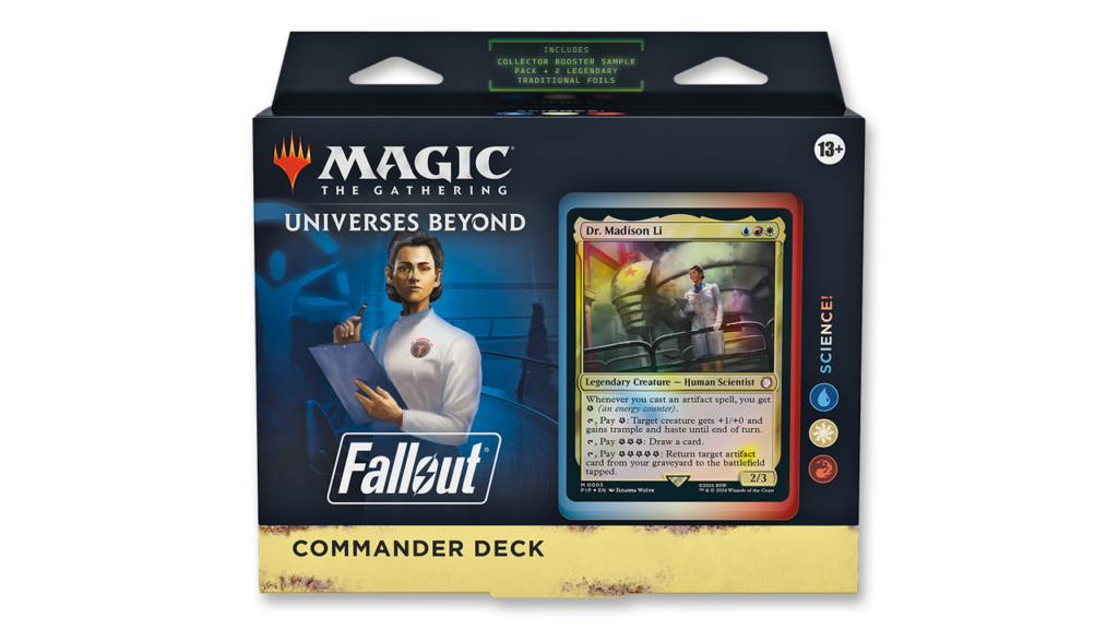 COLLECT SPECIAL FALLOUT CARD TREATMENTS—Each deck comes with a Collector Booster Sample pack containing 2 special alt-frame cards, including 1 Rare or Mythic Rare card