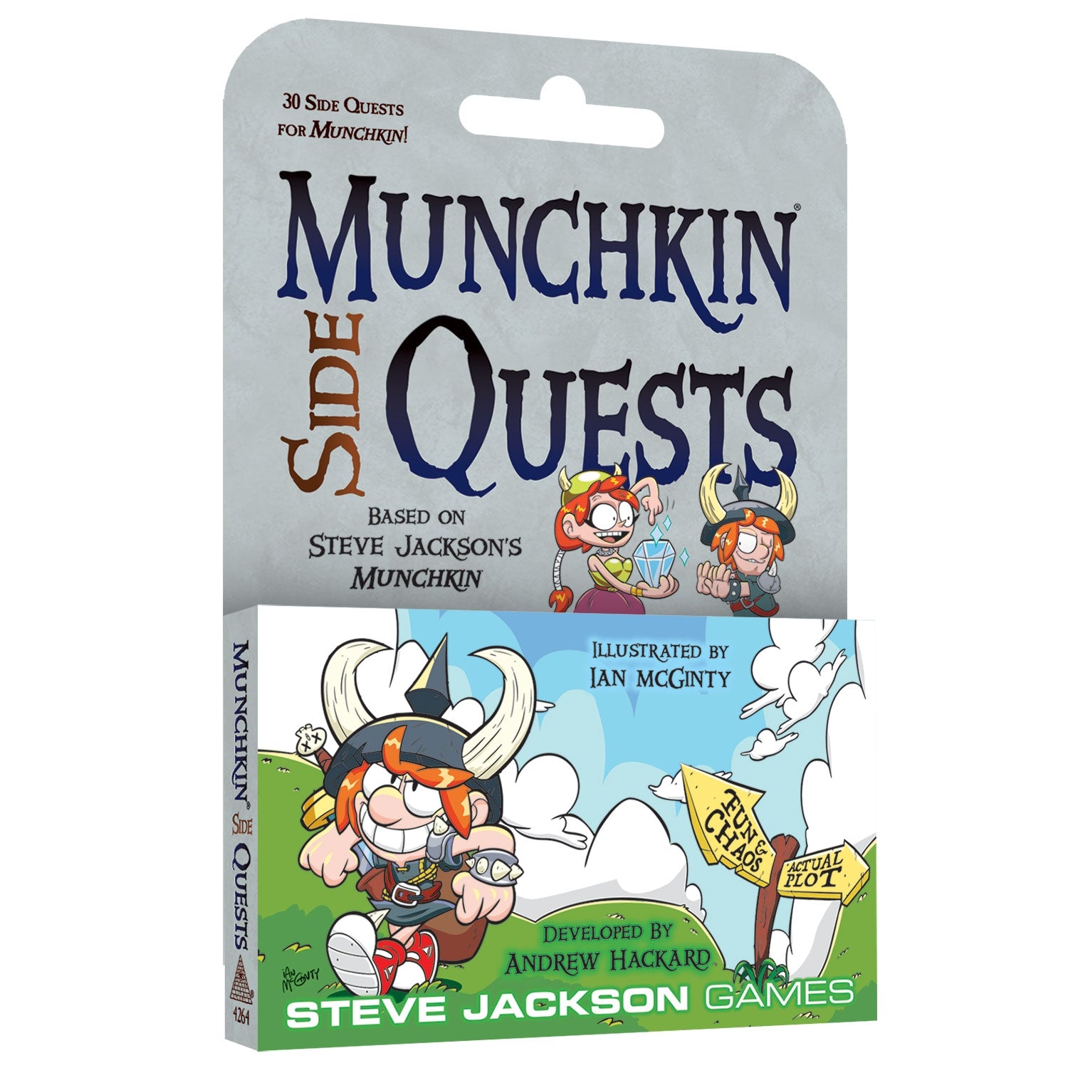 When you need a short detour from the business of killing monsters and betraying your friends, try Munchkin Side Quests! This 30-card expansion can be added to any of your Munchkin games, and it's illustrated by Ian McGinty, who has previously drawn for the Munchkin Collectible Card Game and Munchkin Magical Mess. Get secret in-game goals that you can complete to cash in for a reward AND, just maybe, surprise everyone with a new way to win the game!