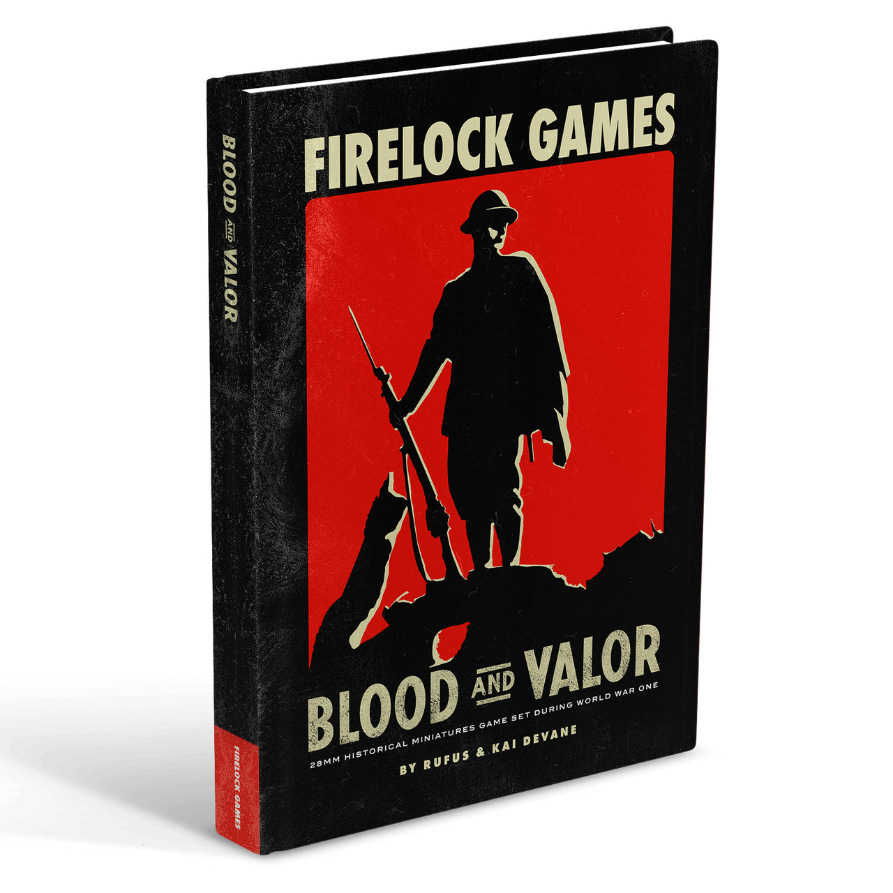 Blood & Valor is a skirmish level game set during the conflicts of the Great War. Those of you who are familiar with Firelock Game’s previous game, Blood & Plunder, will feel at home with this game’s mechanics. Players deploy custom forces representing a Nationality, determine a scenario, and layout terrain to recreate one of the historical battlefields of the Great War. Miniatures not included with rulebook.