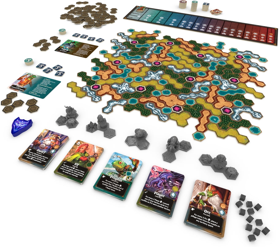 Manipulate factions. Secretly contribute cards to influence the outcome of conflicts. The winning faction enlarges their territory and the defeated faction disappears from the map!
