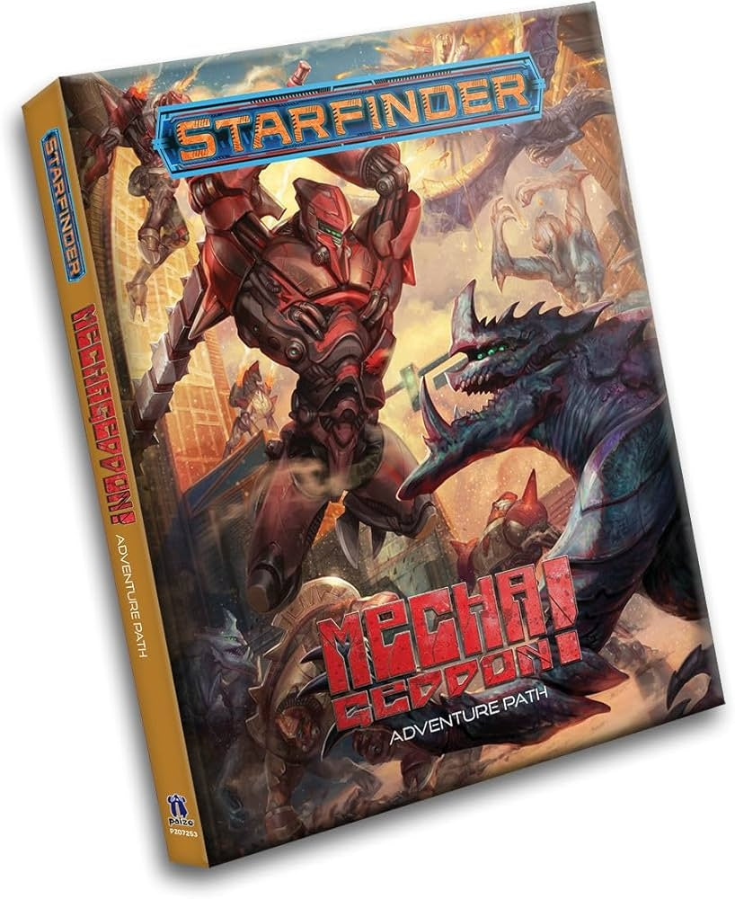 This 184-page hardcover campaign tells the story of rookie mech pilots on Daimalko, starting out as city defenders and venturing to the stars as the heroes become galactic celebrities. This epic campaign spans levels 3 to 18 and features new mechs, bonus adventures designed to slot into the campaign as interludes or stand on their own as one-shots, mech-sized maps, and more. Mechageddon! is an exciting introduction to mech combat and the Starfinder RPG, packed with adventure content and new rules you can use to build the ultimate mech campaign!
