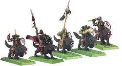 This box set contains 5 Hobgoblin Wolfboys, including Oglah Khan, a standard bearer and horn blower.
